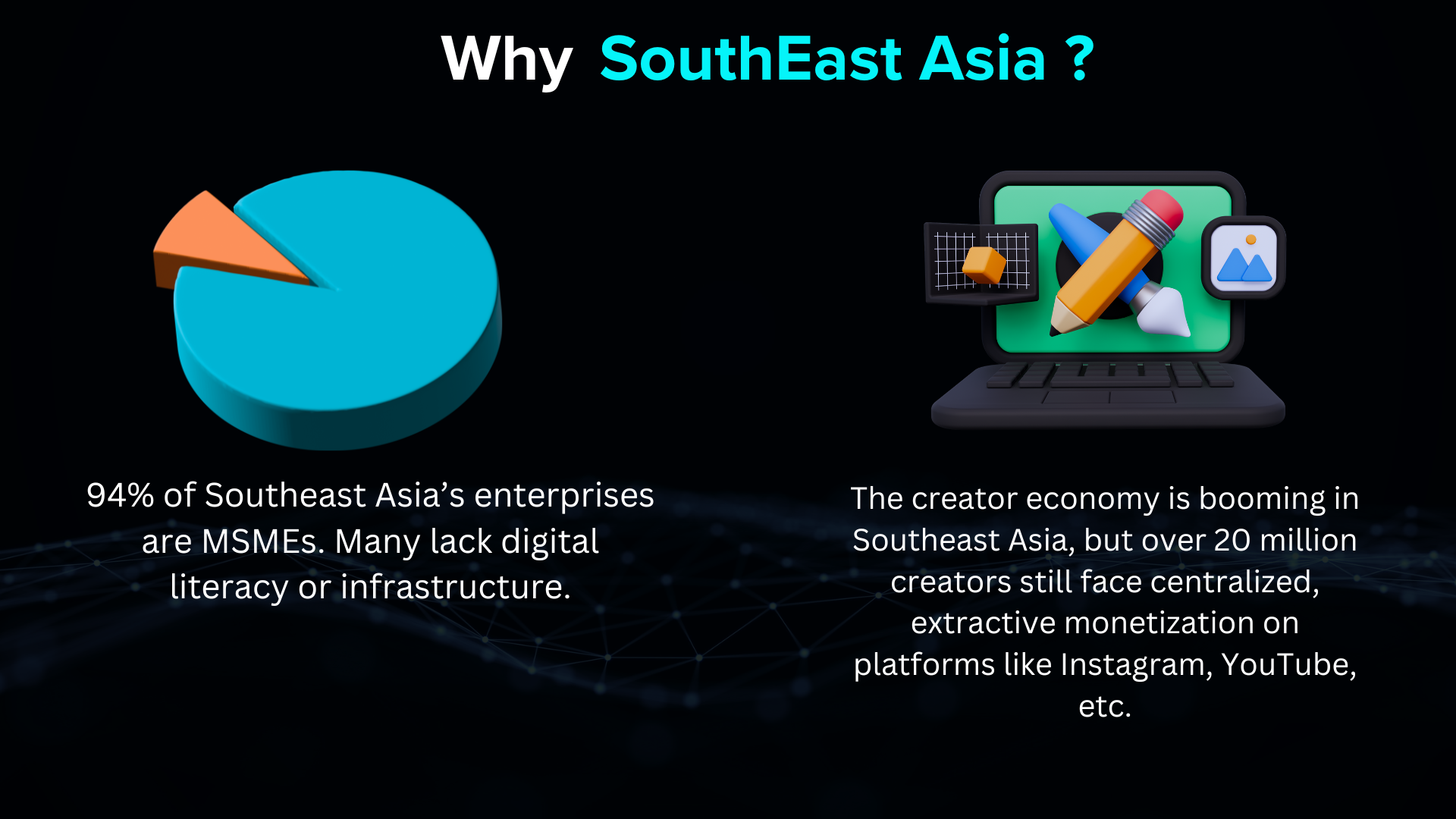 * The **creator economy** in the region is exploding, with platforms like TikTok, YouTube, and Shopee giving rise to over **20 million monetizable creators**, but monetization remains centralized and extractive.