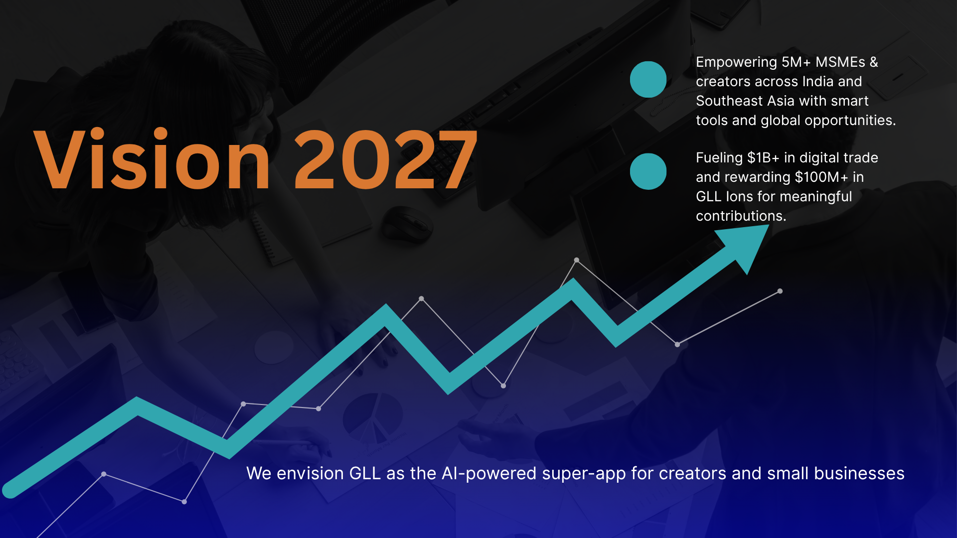 By 2027, our goal is to empower **5 million+ MSMEs** and creators across India and Southeast Asia, reward **$100M+ in GLL Ions**, and enable **$1B+ in digital commerce** via our platform.