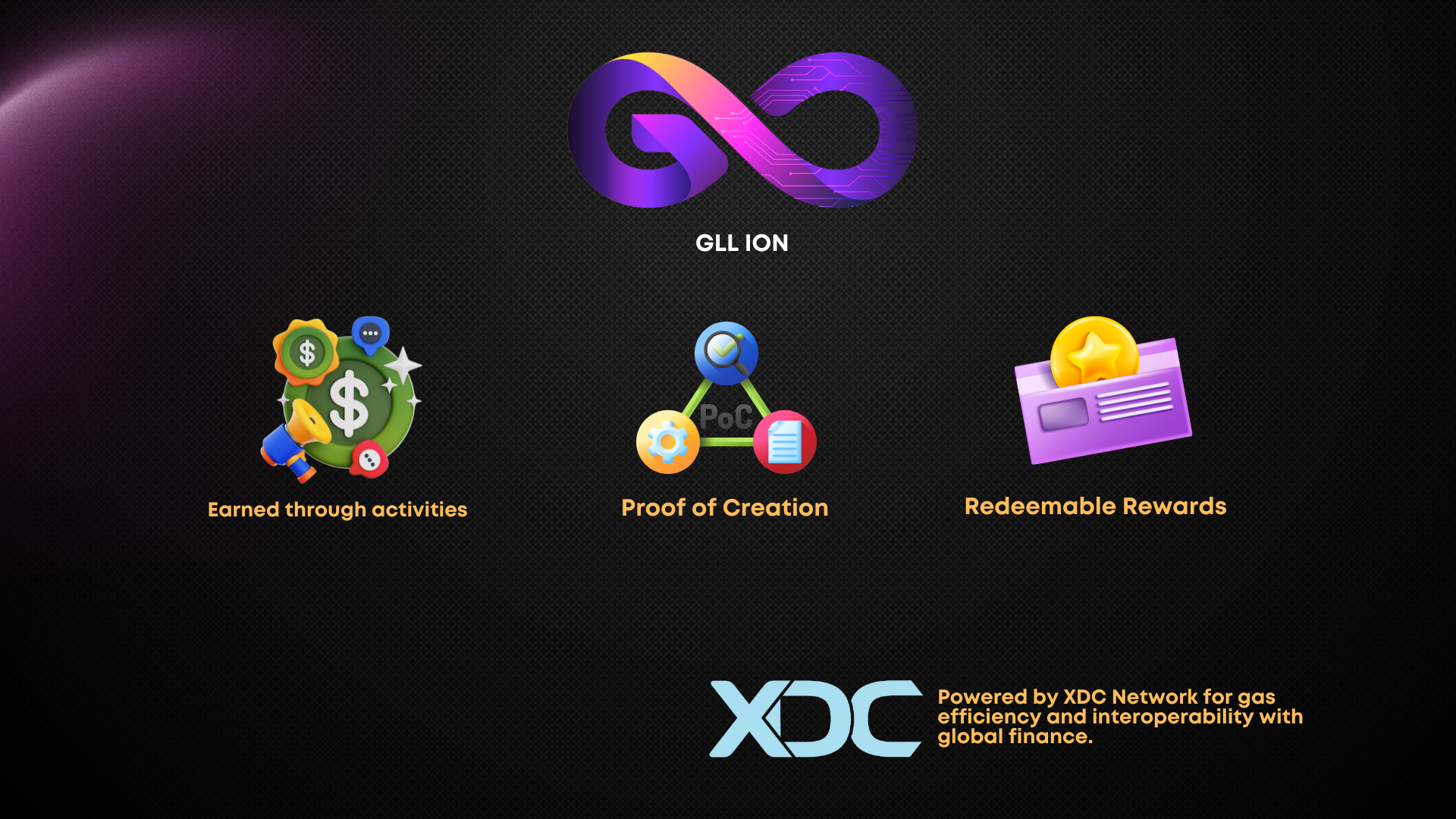 At its core, GLL empowers individuals and small businesses to **create, transact, and grow** within a borderless, trustless, and reward-based economy — all while gaining access to a **suite of modular AI tools**, seamless invoicing, proof-of-creation tracking, and intelligent export matchmaking. Every meaningful user action — from issuing an invoice to publishing content or making a business connection — earns **GLL Ions**, our native XRC20 token deployed on the **XDC Network**, designed for fast, low-cost, and scalable utility.